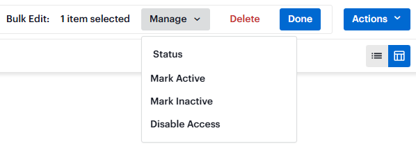 - Click the drop-down next to Manage to bulk change the contacts' status, or click Delete.