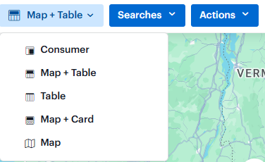 Map + Table View: opens all Search filters on the left side of the screen, with a map view with the listings pinned and the listing results in a Table View on the right-hand side.