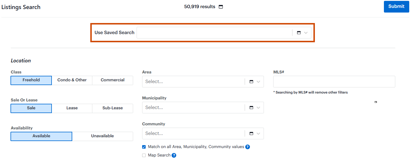 - The Listings Search window will open. Choose the search criteria for your search. Additional filters can be accessed by scrolling down the page*
