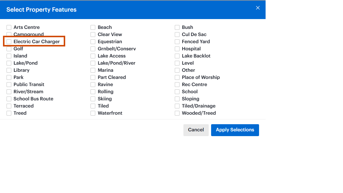 Once you have added Property Features, you can scroll through the options from the drop-down menu, or you can click the suggestions dialogue box. Select Electric Car Charger, then click Apply Selections.