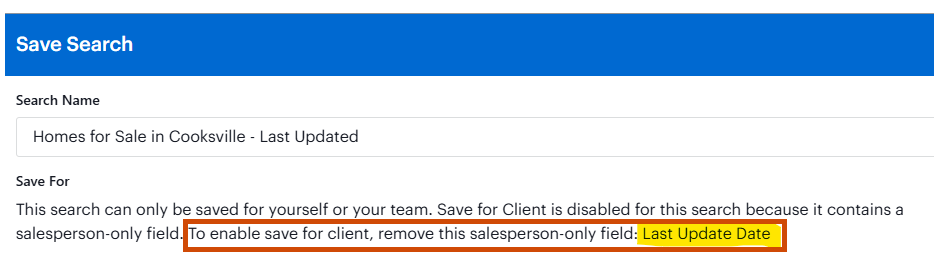 If you have done a search and are trying to save it for a client, but they are not in the list to choose from, look under Save For to see if this message appears