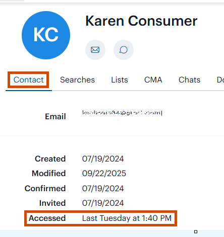 Under Contacts, click on your client's name and ensure you are in the section that shows their contact information. You will see at the bottom the last time they accessed REALM.